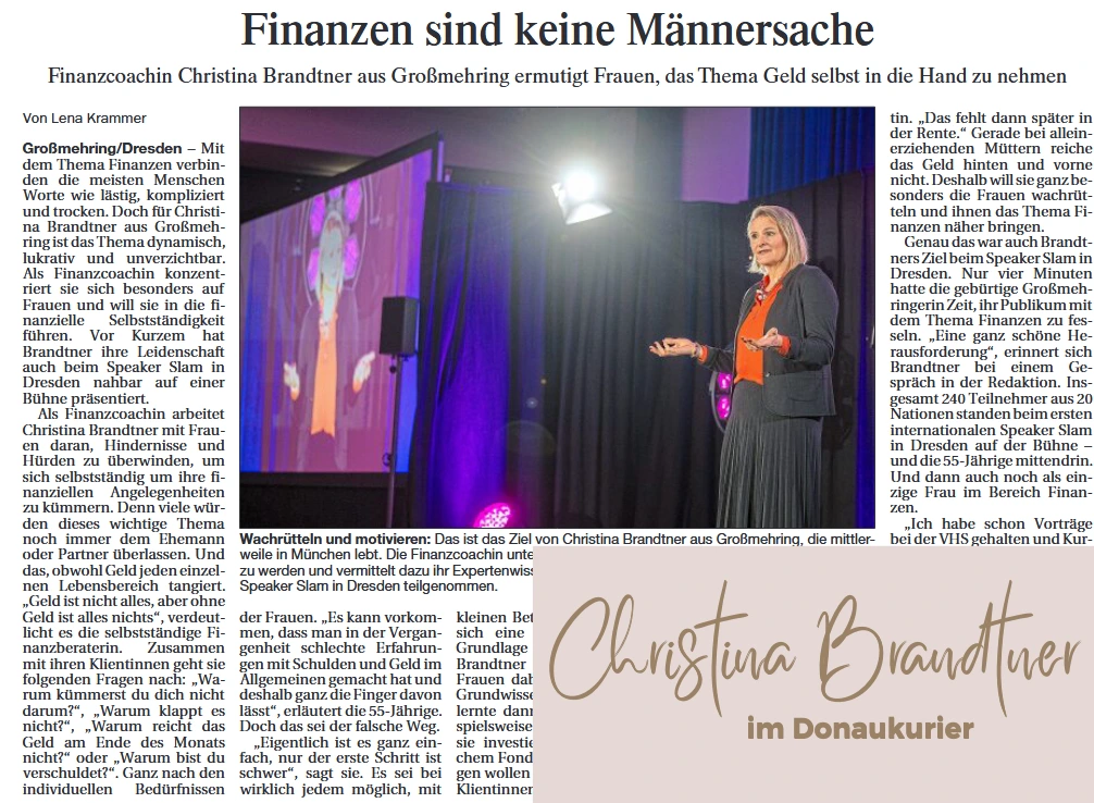 Mit dem Thema Finanzen verbinden die meisten Menschen Worte wie lästig, kompliziert und trocken. Doch für Christina Brandtner aus Großmehring ist das Thema dynamisch, lukrativ und unverzichtbar…